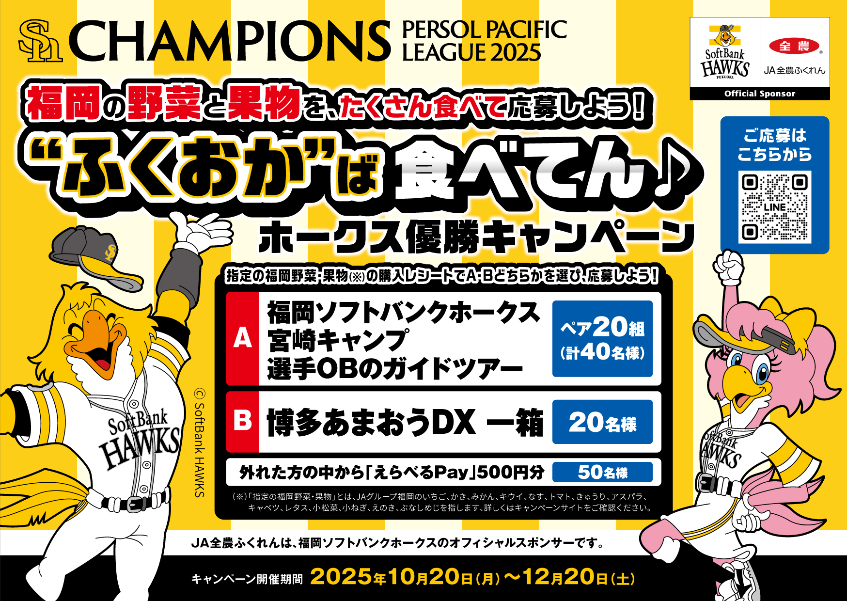 全国農業協同組合連合会 福岡県本部(以下、「当会」 )が主催する、「ふくおかば食べてん♪ホークス優勝キャンペーン」(以下、「本キャンペーン」 )をご利用の方(以下、「ユーザー」 )は、以下をよくお読みいただき、同意の上ご応募ください。なお、本キャンペーンのご応募をもって、以下の内容に同意されたものとみなします。